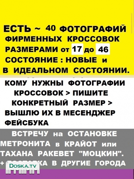 Кроссовки фирменные. Каждая пара имеет свой конкретный размер, фирму, цену, которые написаны на каждой фотографии. Кроме представленных нескольких фотографий есть ещё больше 30 фотографий кроссовок в размерах от 17 до 46 > кому надо > напишите КОНКРЕТНЫЙ размер / ы > вышлю эти фотографии на Вашу электронную почту ( мой E-mail : now4@yandex.ru ). Состояние кроссовок : новые и в идеальном состоянии.